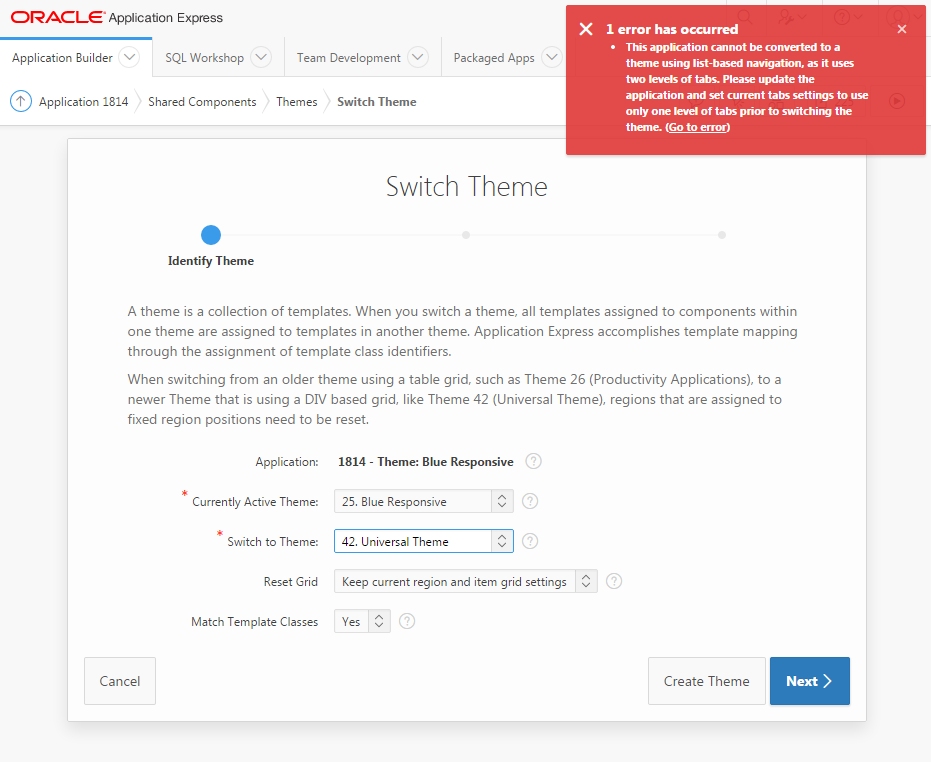 In this example, with a label column span of 3 plus each item's column span of 1, all 4 together means that the content is 16 columns wide. This exceeds the 12 columns supported by the Universal Theme which results in this error being thrown before the page is rendered in your browser. To Fix: navigate to the page item specified in the error message in page designer or component view, and reduce the number of label column spans that your elements consume.