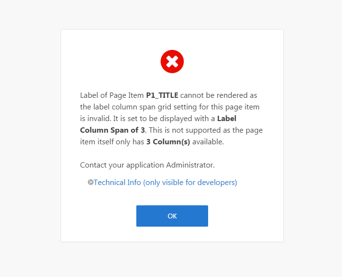 When running my app on a certain page, I get the error message "Label column span grid setting for this page item is invalid."